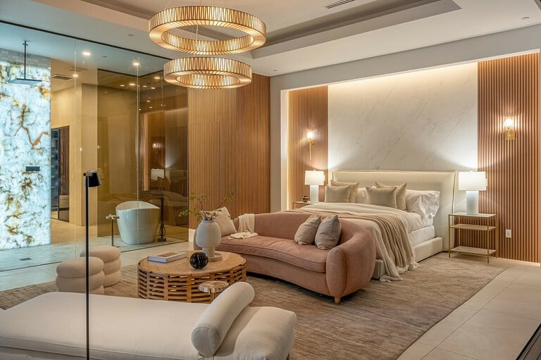Each of the seven bedrooms offers its own sense of calm and privacy. Natural materials like bouclé, linen, wood paneling, and honed stone create peace. The primary suite doubles as a lounge, with an en-suite bathroom that glows behind a backlit translucent stone wall. The furniture, including a Bayonne crescent sofa and a Bogota coffee table with limestone top, softens the architecture without sacrificing sophistication.